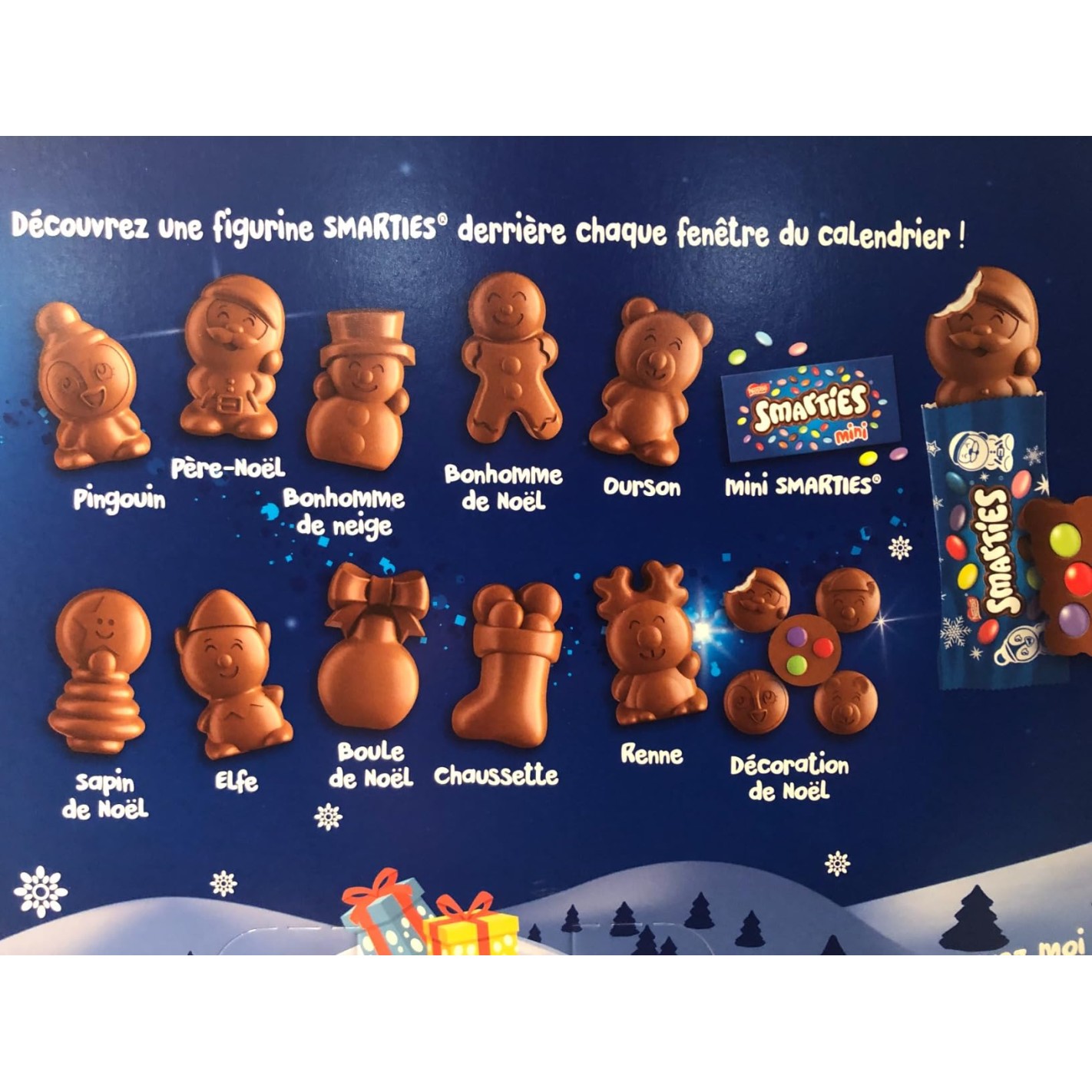 Derrière son design festif et coloré, ce coffret cachent 24 surprises chocolatées au lait ! Le délicieux goût des bonbons Smarties décliné en plusieurs formes : figurines; décorations et mini sans oublier une surprise le dernier jour.